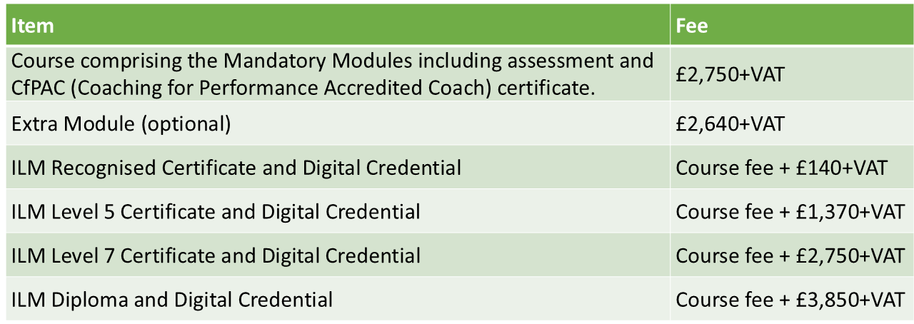 If candidates wish to undertake the Extra Module of online coach training listed above, and/or extra ILM Levels credentials, either at the time of the course or later, the full course fees, block booking discounts and VAT on the concessions become payable.
